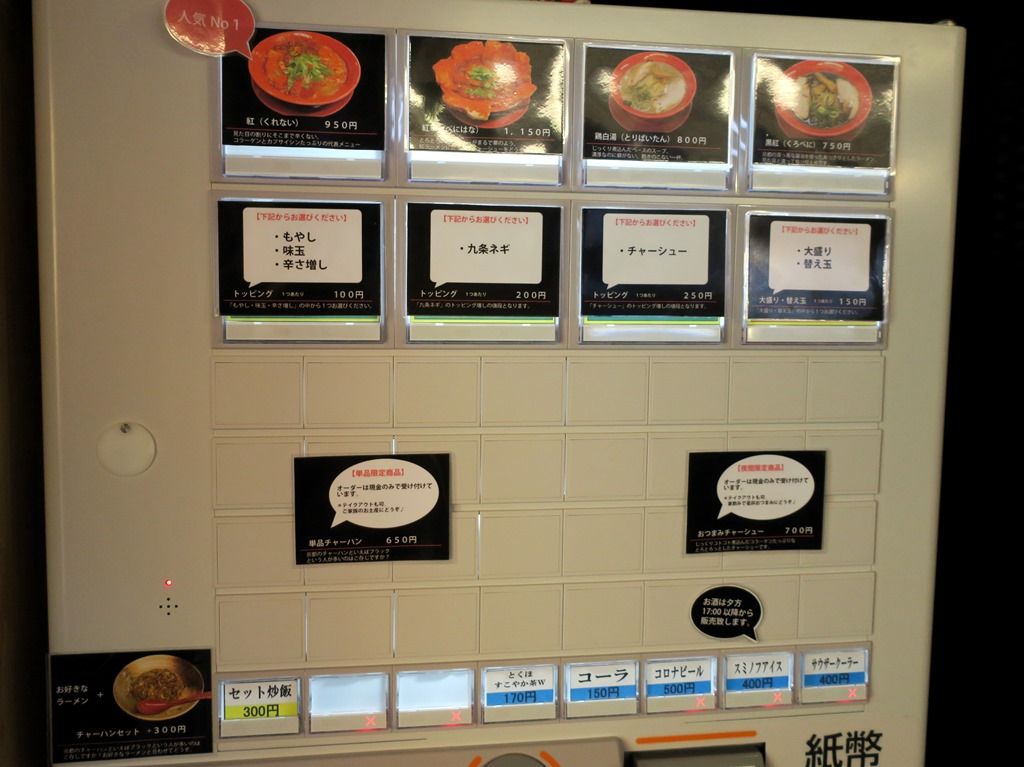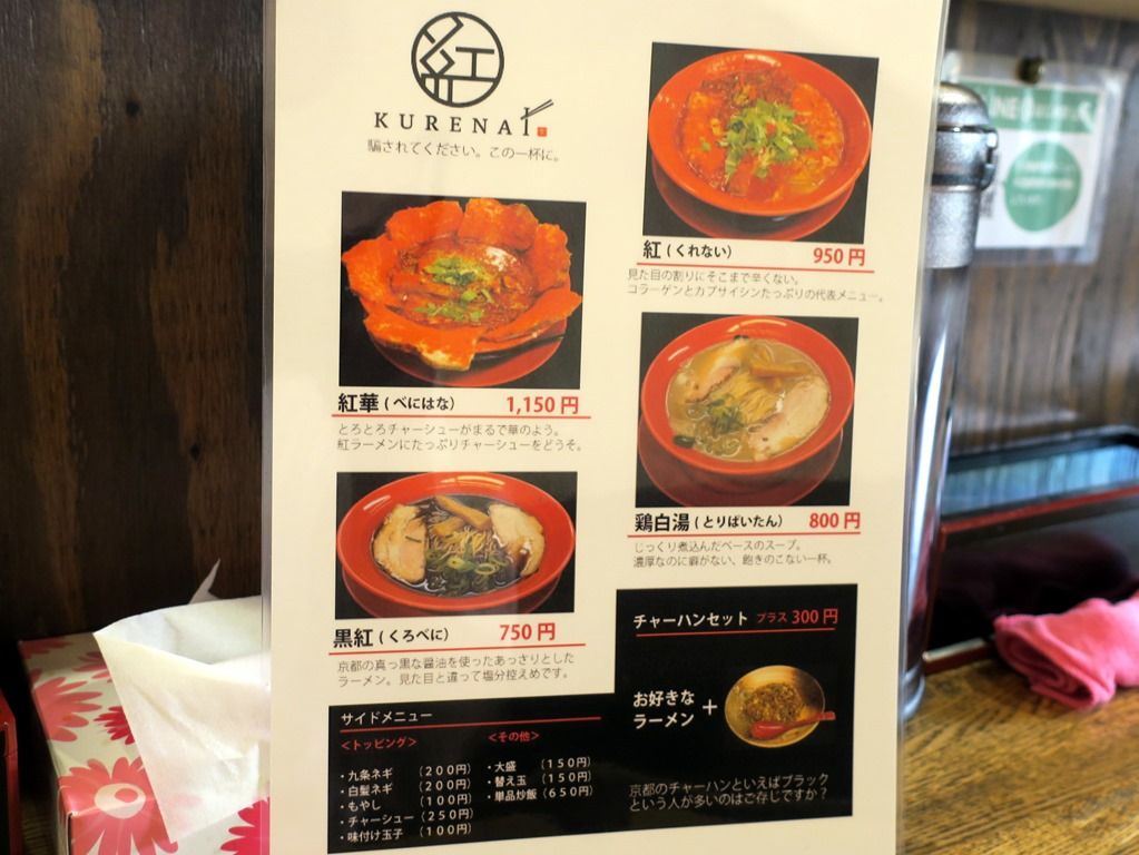 主なメニューは、紅950円、紅華1150円、鶏白湯800円、黒紅750円。チャーハンセット(おすきなラーメン+300円)、他。