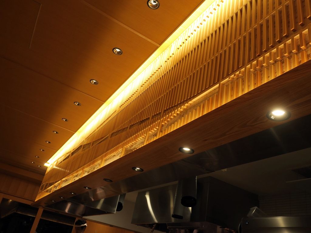 店内は厨房を囲むL字型カウンターで長い辺が11席、短い辺が6席位?埋まってる席が少なくて、数えるのが困難。