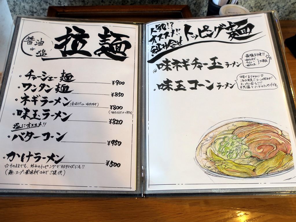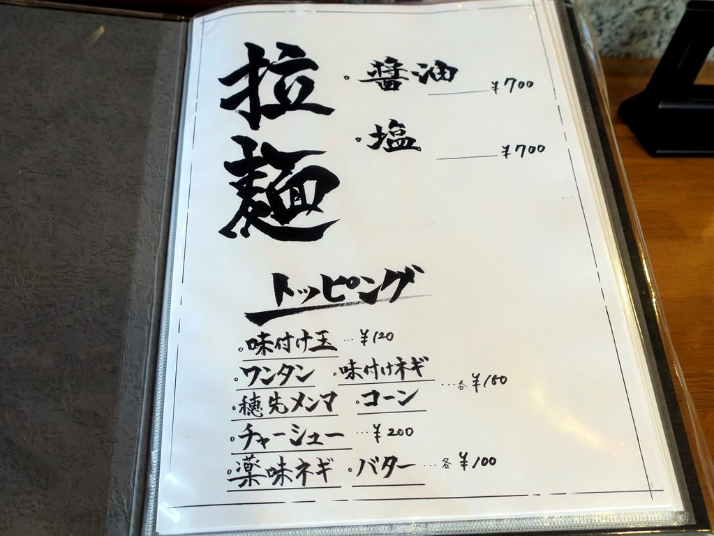 券売機は無く後会計制。主なメニューは、醤油拉麺700円、塩拉麺700円、他。もつ飯330円は、居酒屋時代の人気の一品をトッピングしたご飯物。