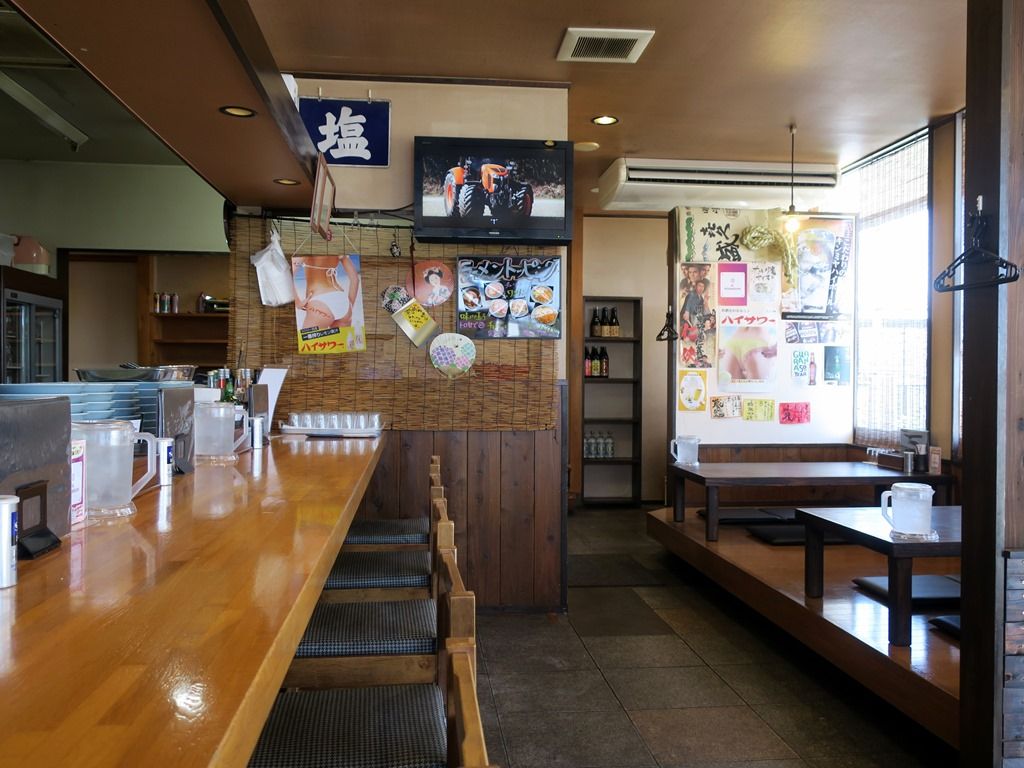 店内は厨房を囲むL字型カウンター10席(7席・3席)、向かって右の小上がりに4人卓x2、左の小上がりに4人卓x1。