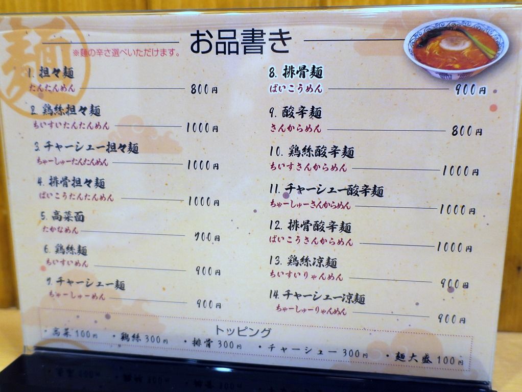 券売機はなく伝票方式後会計制。主なメニューは、担々麺800円、排骨担々麺1000円、排骨麺900円、酸辛麺800円、他。