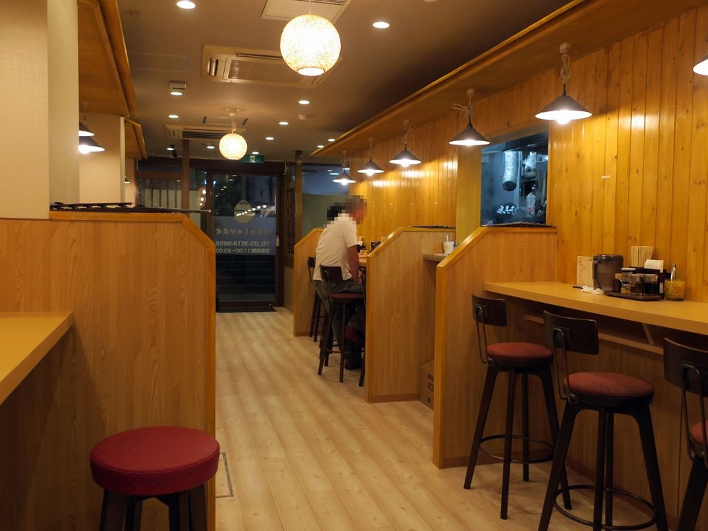 奥に長い店内は、壁に向かったカウンター17席、反対側の壁に向かったカウンター8席、4人卓x2。夜は喫煙可能で、言えば灰皿を出してくれてました。20時頃到着で、先客2、後客6。スタッフは、ホール担当の女性2、厨房に男性3。
