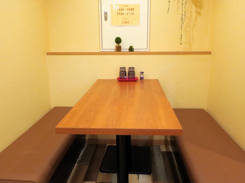 席は、厨房前に奥が狭く手前が広くなった段差のあるカウンター8席(3席・5席)、一番奥に4人卓x1。