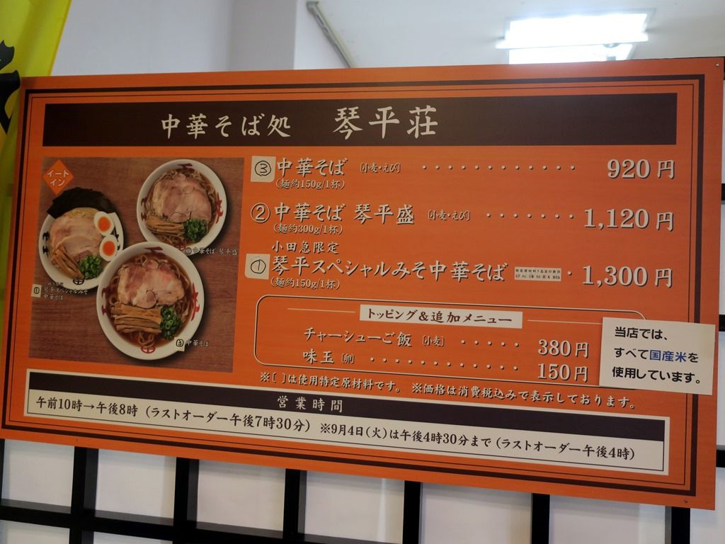 催事メニューは、中華そば920円、中華そば琴平盛1120円、琴平スペシャルみそ中華そば1300円、他。本店のこってりと塩はなくあっさりのみ。小田急限定は「みそ」のスペシャル(特製)バージョン。