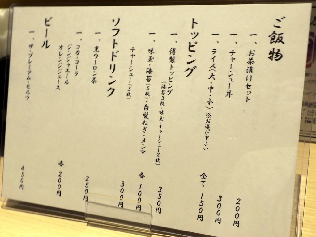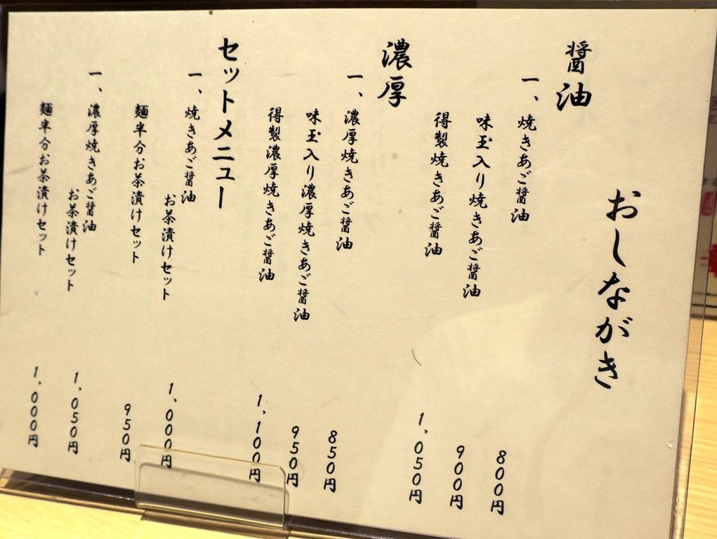 主なメニューは、焼きあご醤油らーめん800円、濃厚焼きあご醤油らーめん850円、他。