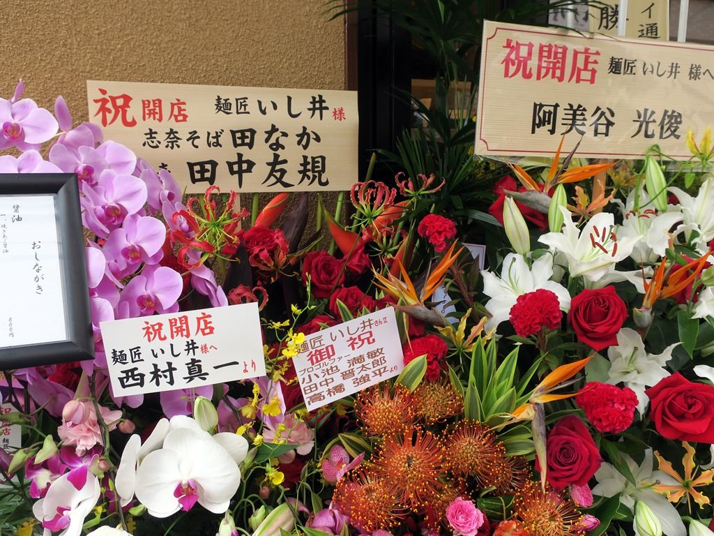 店頭には、志奈そば 田なかの田中さんとプロゴルファー御三方からの開店祝花。