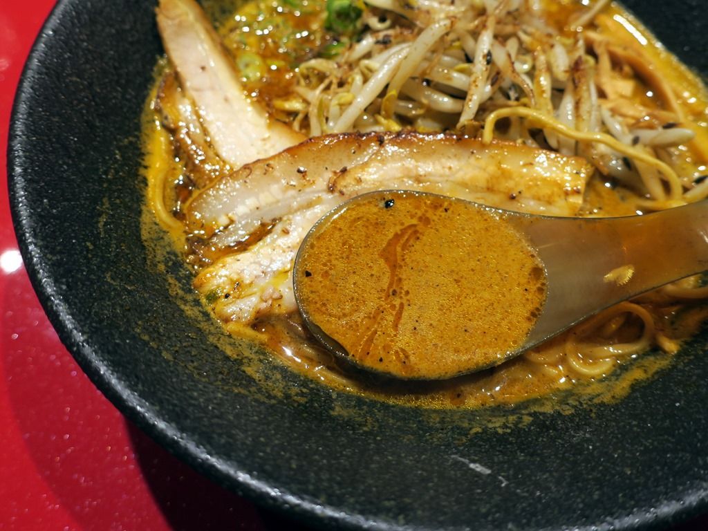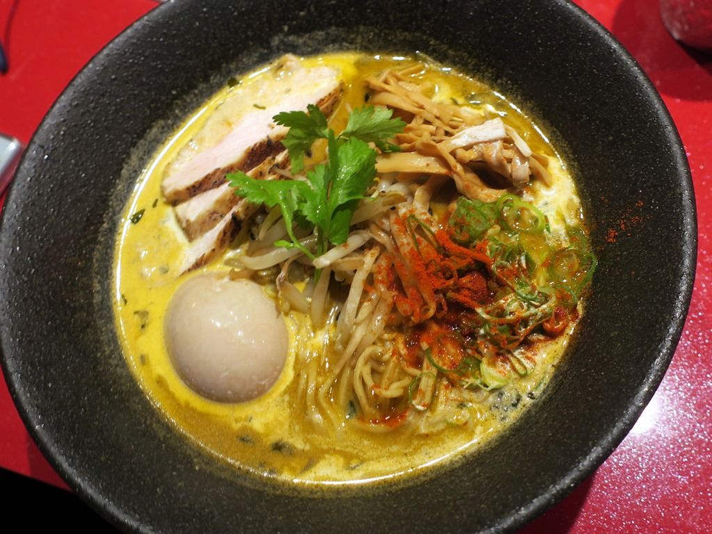 マッハさんの「北インドのスパイス味玉らぁめん」。一口味見させてもらいましたが、非辛でまんまバターチキンカリーでした。