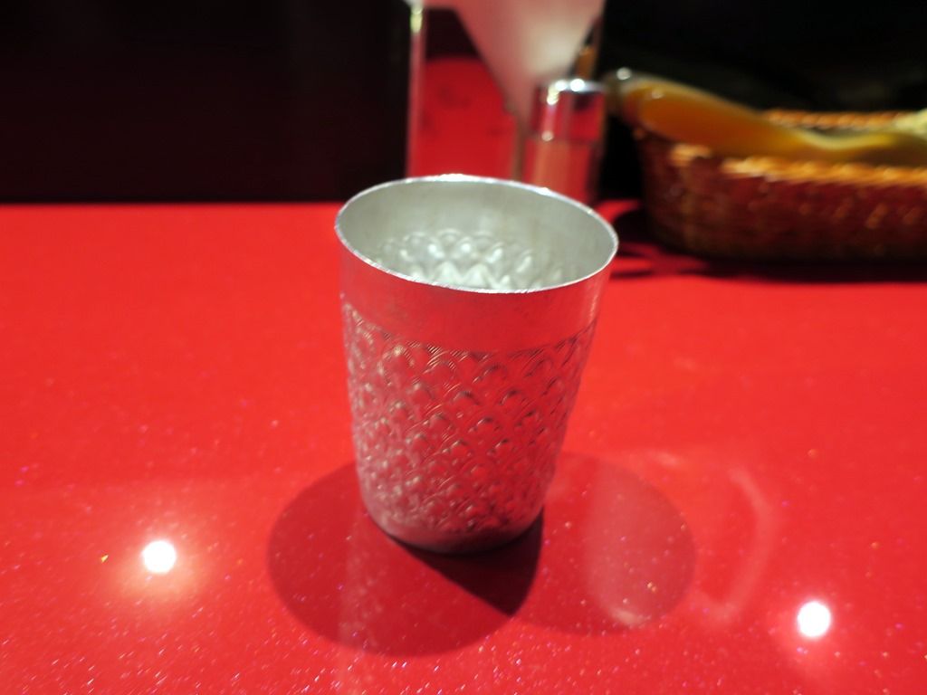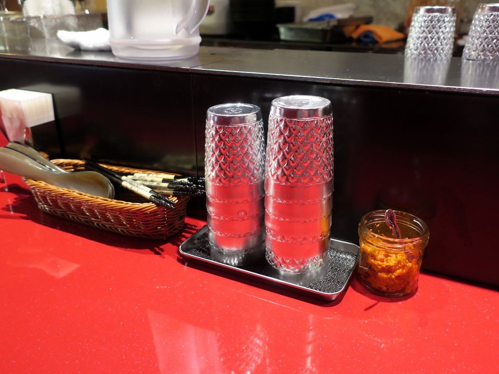 お冷はカウンター上のピッチャーにレモン水。コップはカウンターに積まれてますが柔らかいアルミ製で、上下が軽くはまってなかなか取れず。力を入れてまっすぐ引き抜こうとすると、コップが簡単に変形して潰れます。