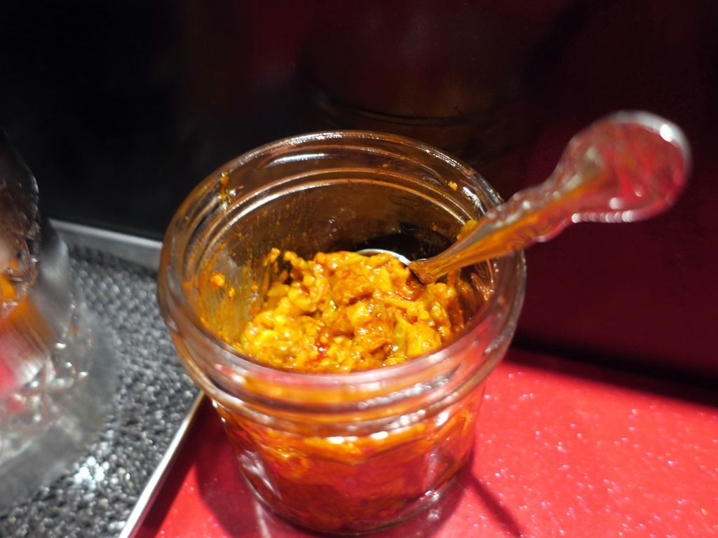 卓上調味料は、アチャール(マンゴーのスパイス漬け・ピクルス)。カレーによく合う薬味だそうです。