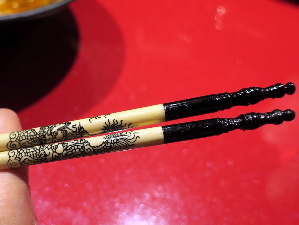 BGMはニューウエーブ。箸は洗い箸でエコ仕様。箸の柄には龍の絵。