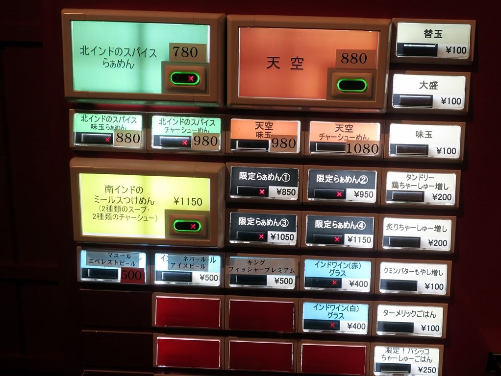 とりあえず券売機で食券購入です。主なメニューは、北インドのスパイスらぁめん780円、天空880円、南インドのミールスつけ麺1150円、他。つけ麺は準備中で、1ヶ月以内には始めたいとか。