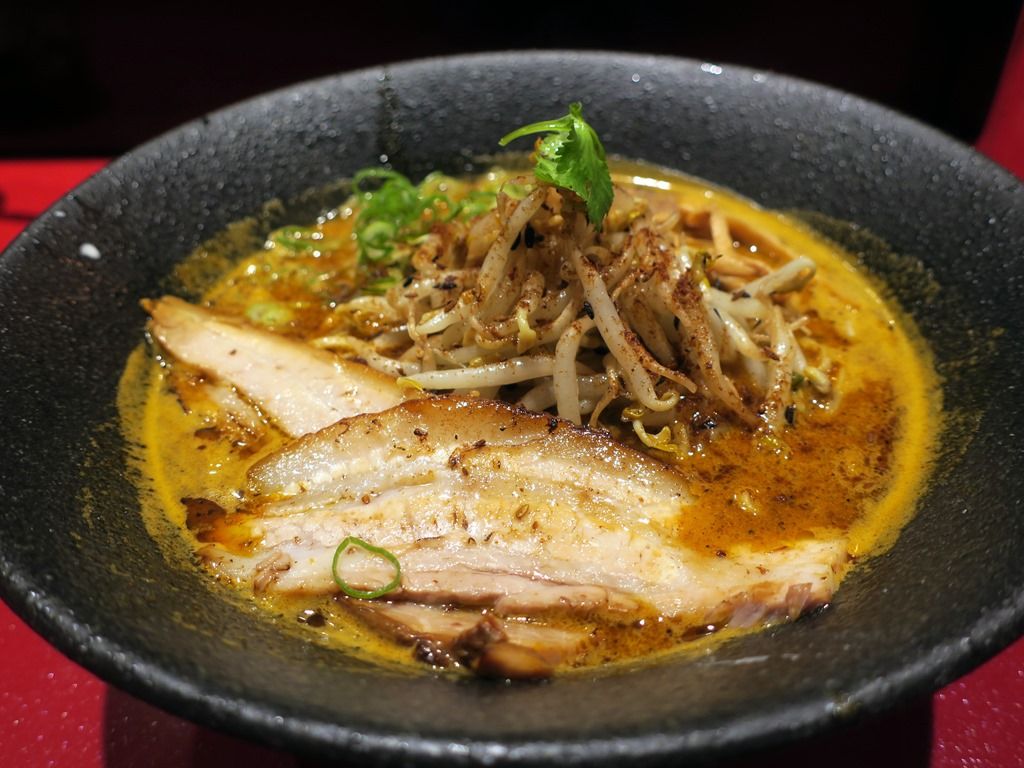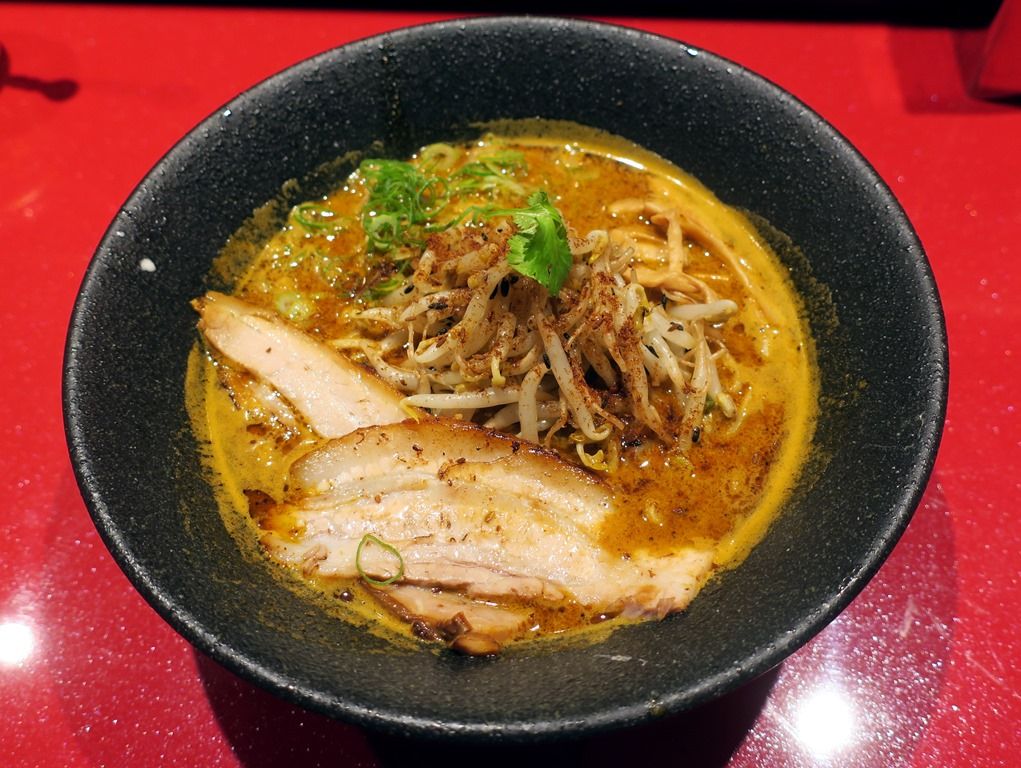 具は炙りチャーシュー、メンマ、もやし、パクチー、きざみ青ねぎ。後から気づいたのですが、炙り豚チャーシューはタンドリー鶏チャーシューに変更可能なようです。