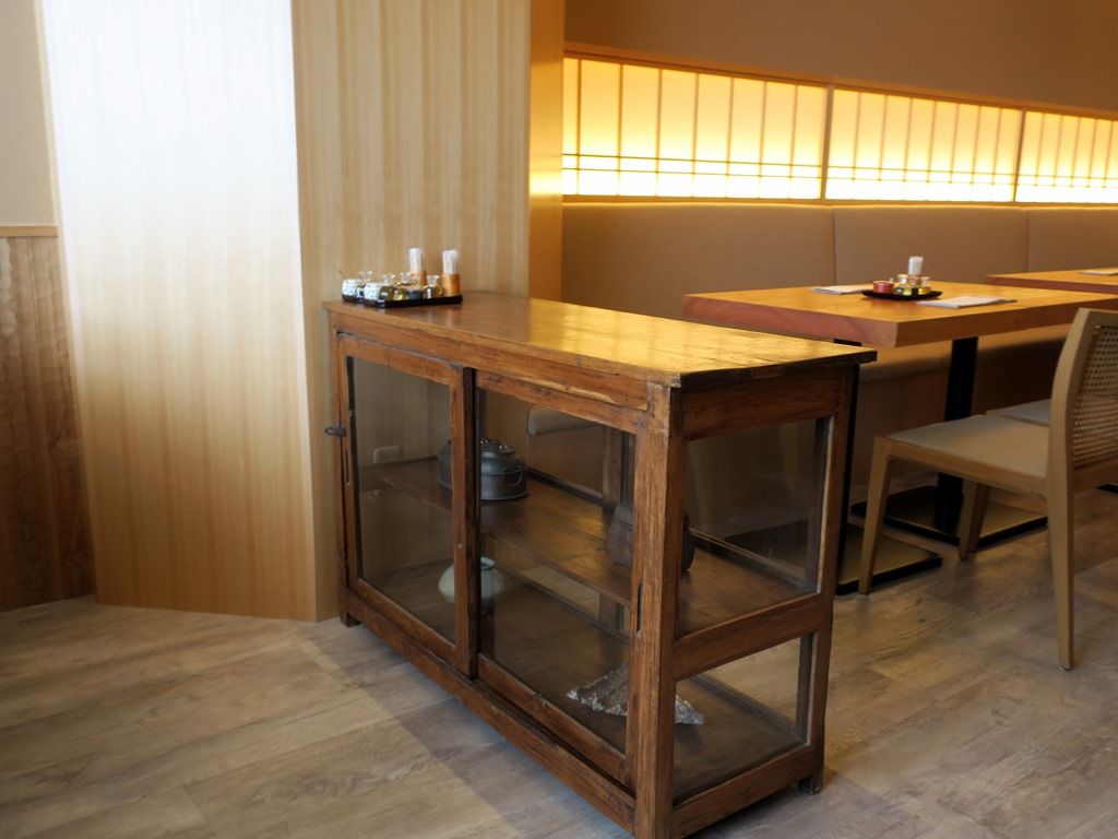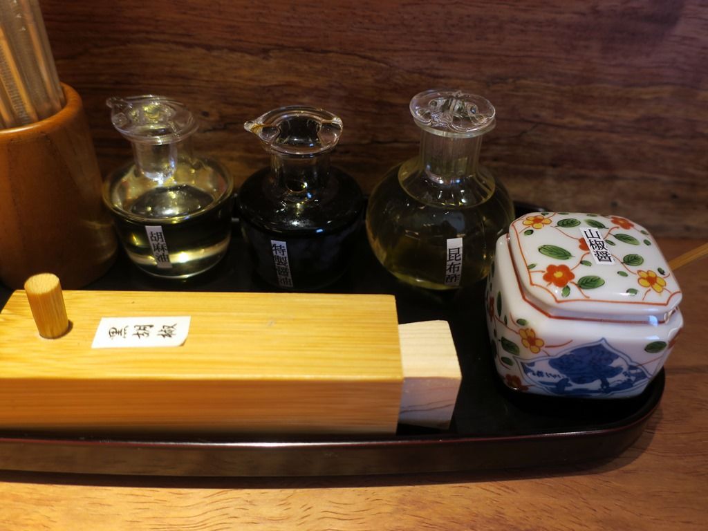 BGMはポップス。料理と一緒に提供される箸は竹の箸ですが、使い捨てかも。卓上調味料は、胡麻油、特選醤油、昆布酢、黒胡椒、山椒醤。