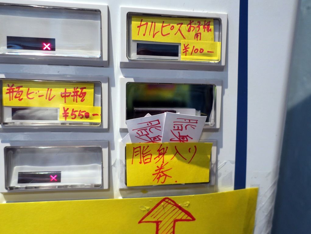 入店するとまず券売機で食券購入です。主なメニューは、ラーメン小200g500円、ラーメン300g700円、ラーメン大450g800円、他。