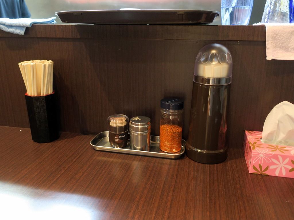 BGMはテレビ放送、ぐるナイなうオンエア。箸は割り箸。卓上調味料は胡椒。七味唐辛子。七味は豪快にドバッと出るので要注意w
