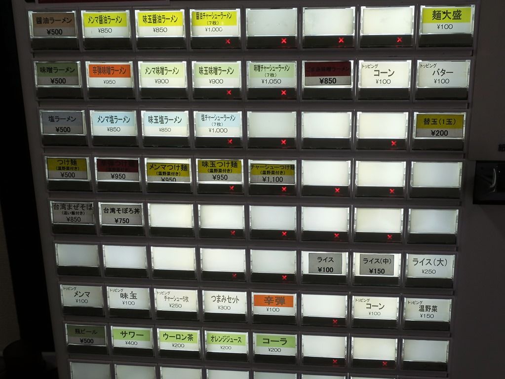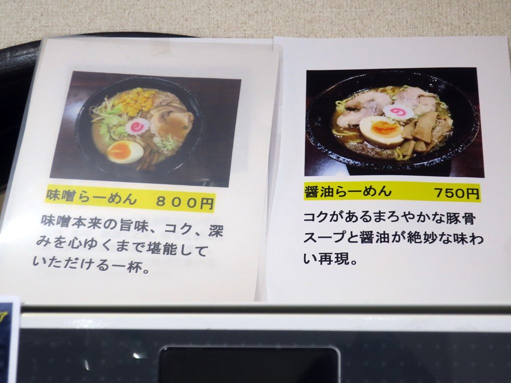入店すると、まず券売機で食券購入です。主なメニューは、醤油ラーメン750円、味噌ラーメン800円、辛味噌ラーメン950円、塩ラーメン750円、つけ麺850円、台湾まぜそば850円、他。