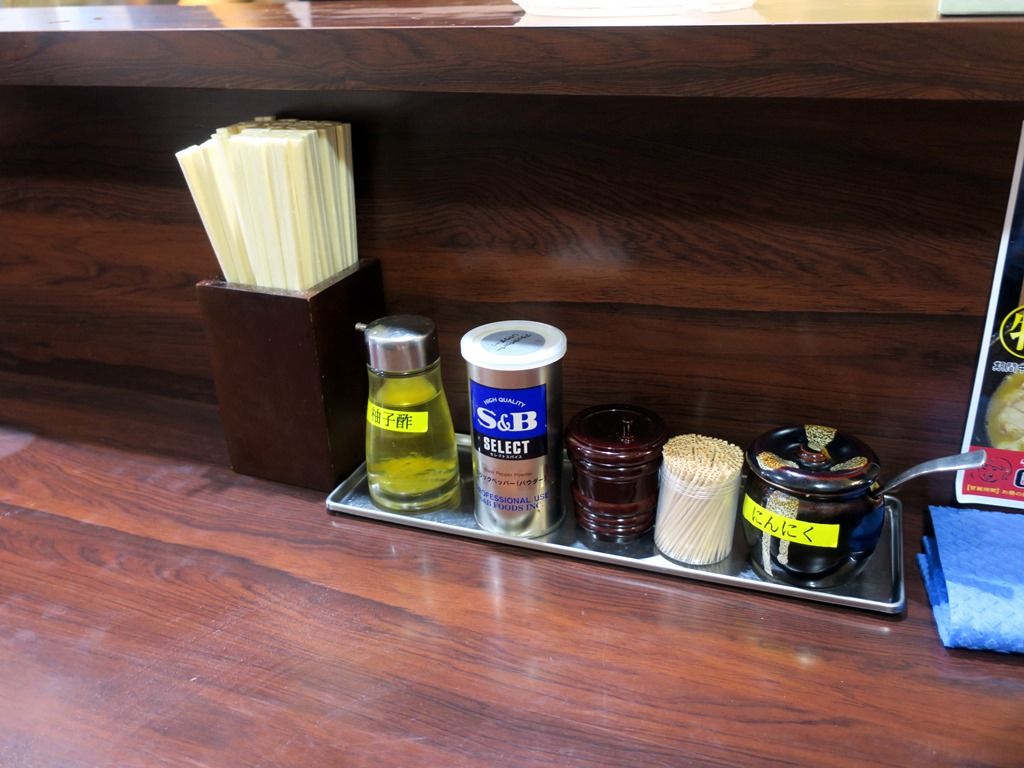 BGMはJ-Pop。箸は割り箸。卓上調味料は、柚子酢、S&Bブラックペッパー、七味唐辛子。