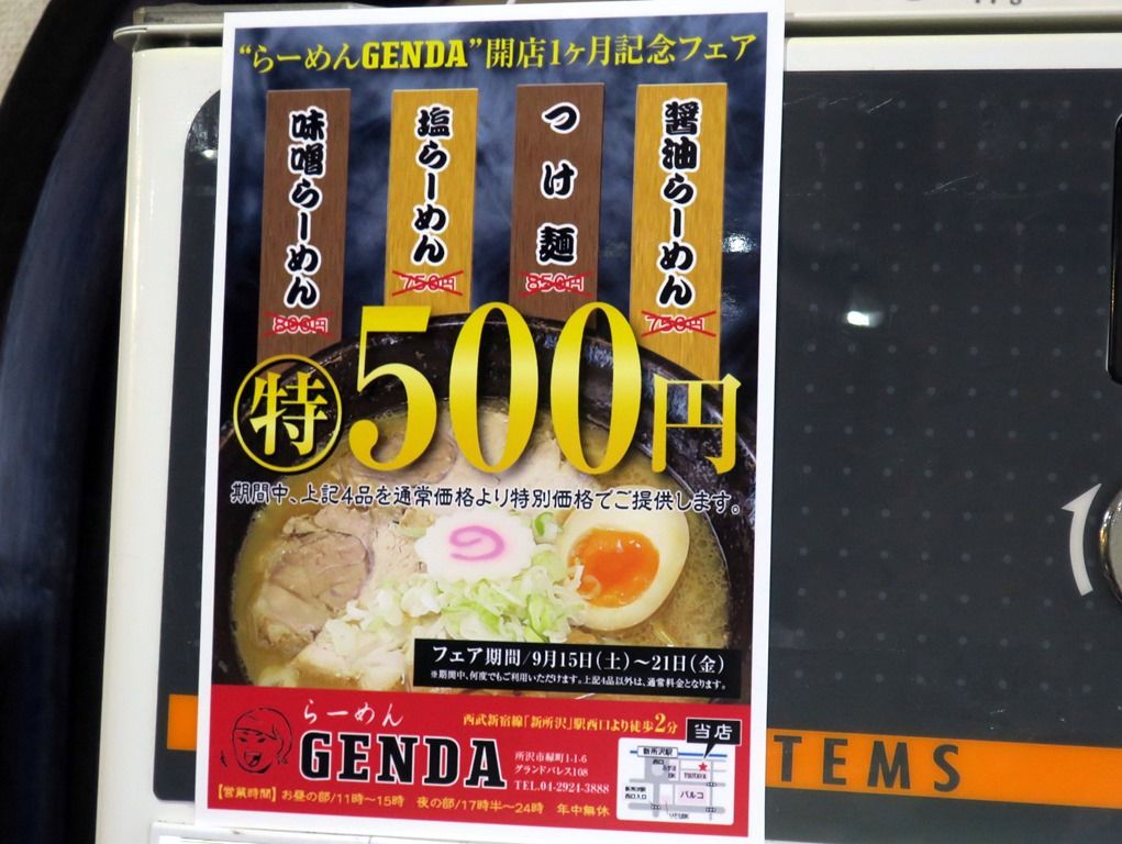 2018年9月15日、新所沢の新店「らーめん GENDA」へ。