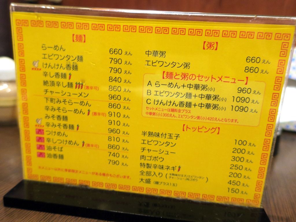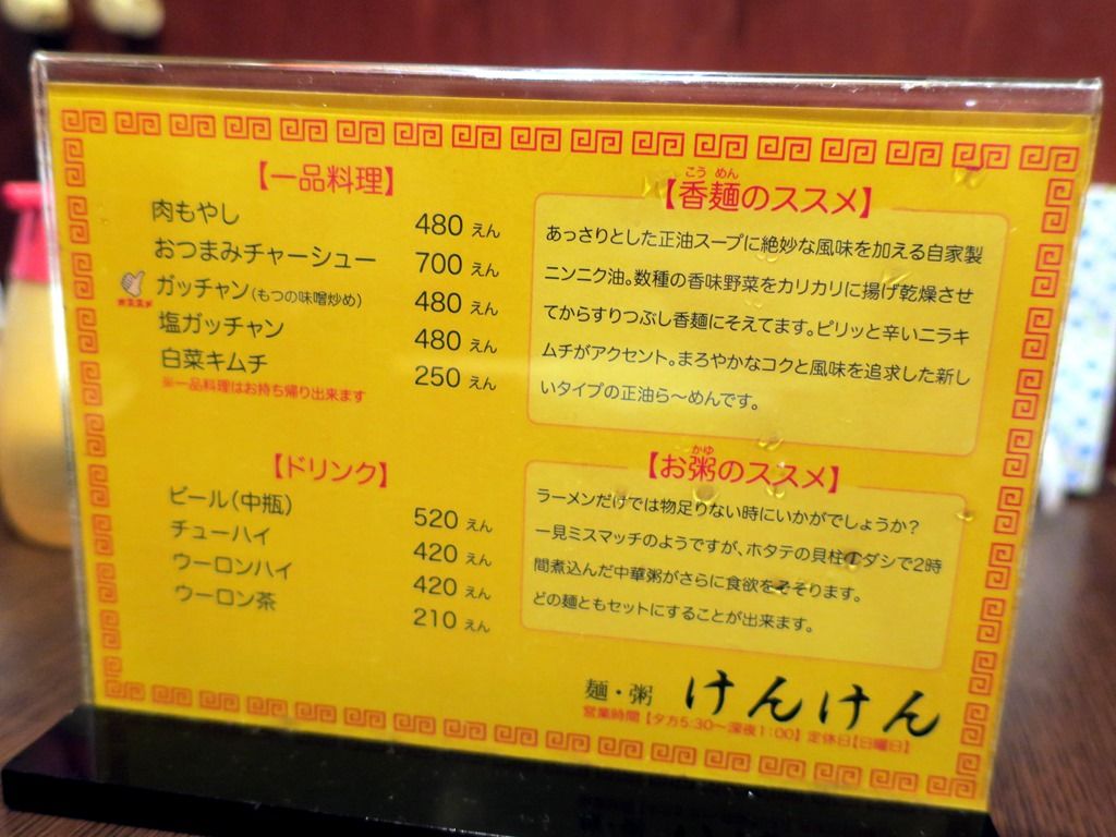券売機は無く後会計制。主な麺メニューは、らーめん630円、エビワンタン麺760円、けんけん香麺760円、下町みそらーめん830円、みそ香麺880円、つけめん780円、