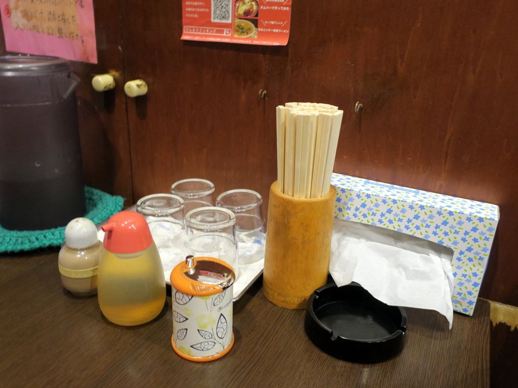 BGMはレゲエ。箸は割り箸。卓上調味料は胡椒、酢。
