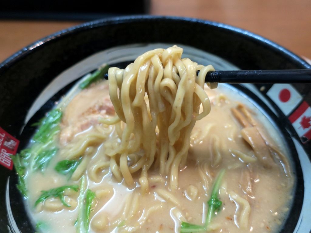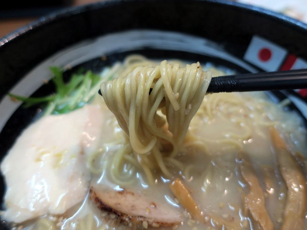 麺はストレート中細タイプ。全粒粉配合で、終盤までしっかりとした食感をキープ。