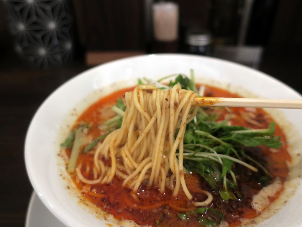 スープはさらりとした清湯で胡麻とラー油と唐辛子・花椒の饗宴。そして、たっぷり入った肉味噌が溶け出して、濃度が加速度的にアップ。海老風味も効果的に効いて、レベル4の辛痺も程よい刺激。自称「担担麺の最高峰」だそうですが、それは置いといても確かに凄く美味しい!