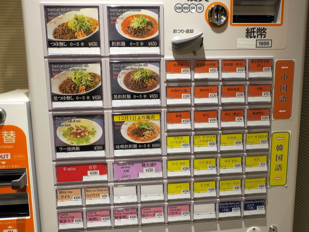 入店すると、まず券売機で食券購。主なメニューは、つゆ無し850円、黒つゆ無し850円、担担麺850円、黒担担麺850円、味噌担担麺900円(12月1日販売開始)、ラー油肉飯380円、他。券売機は日本語・英語・中国語・韓国語の4ヶ国語表記。