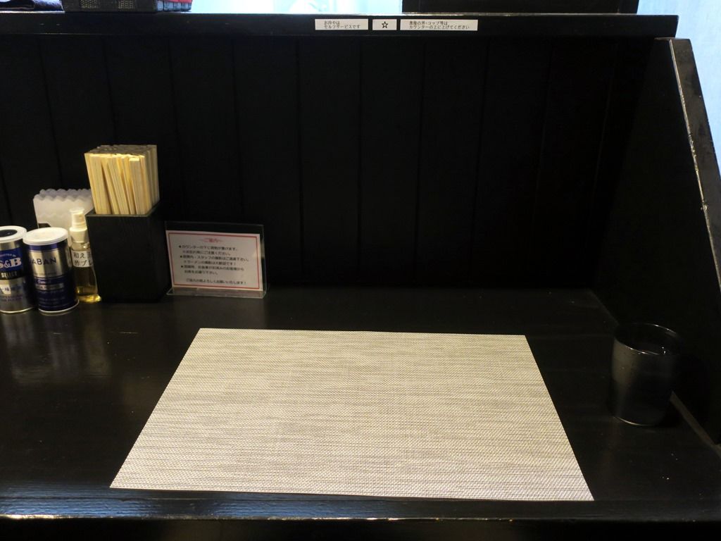 BGMはロック。箸は割り箸。卓上調味料はS&B一味唐辛子、GABANブラックペッパー、和え玉用酢プレー。