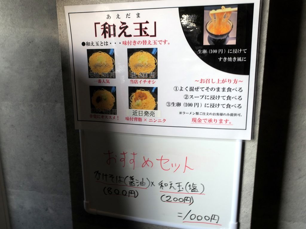 主なメニューは、かけそば(醤油・塩)800円、中華そば(醤油・塩)1000円、肉中華そば(醤油・塩)1200円、和え玉(醤油・塩)200円、和え玉(激辛)300円、他。