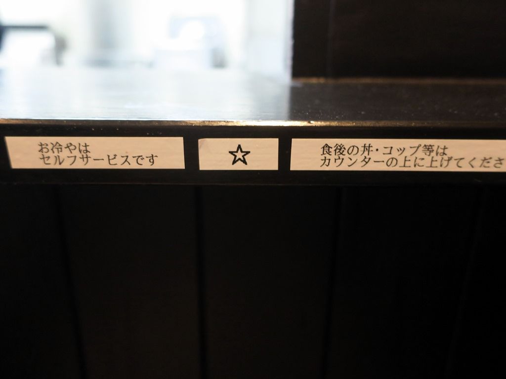 カウンターに貼られた☆印は、そこを中心として座ると、両側から等間隔で快適に着席出来る目安。