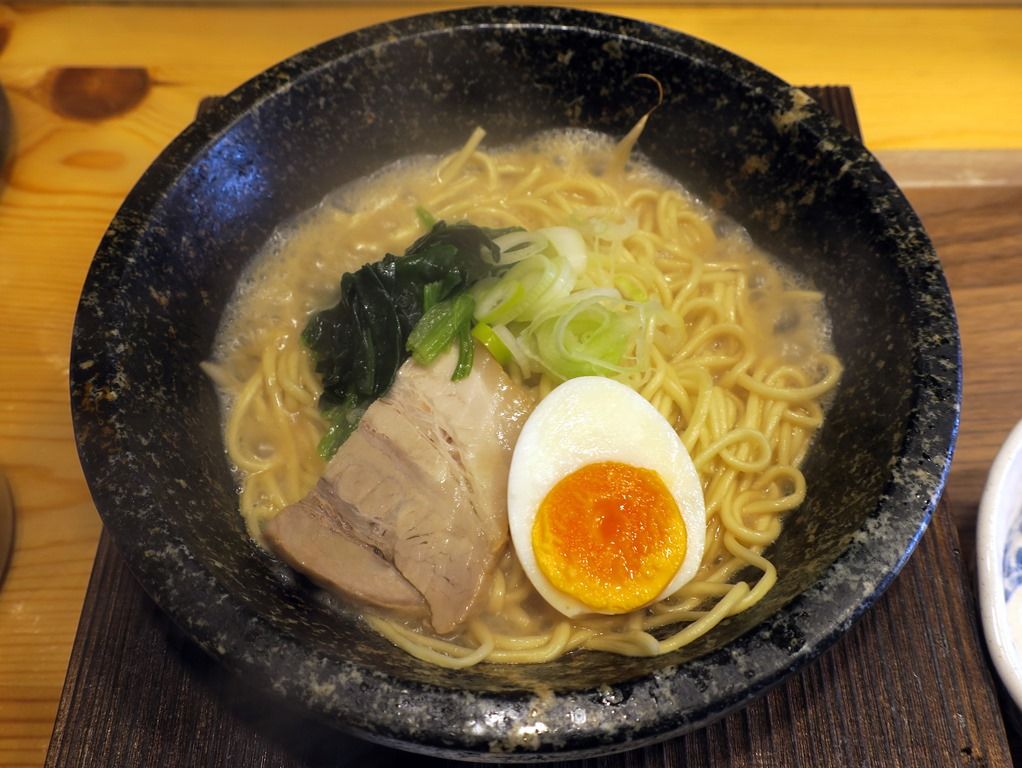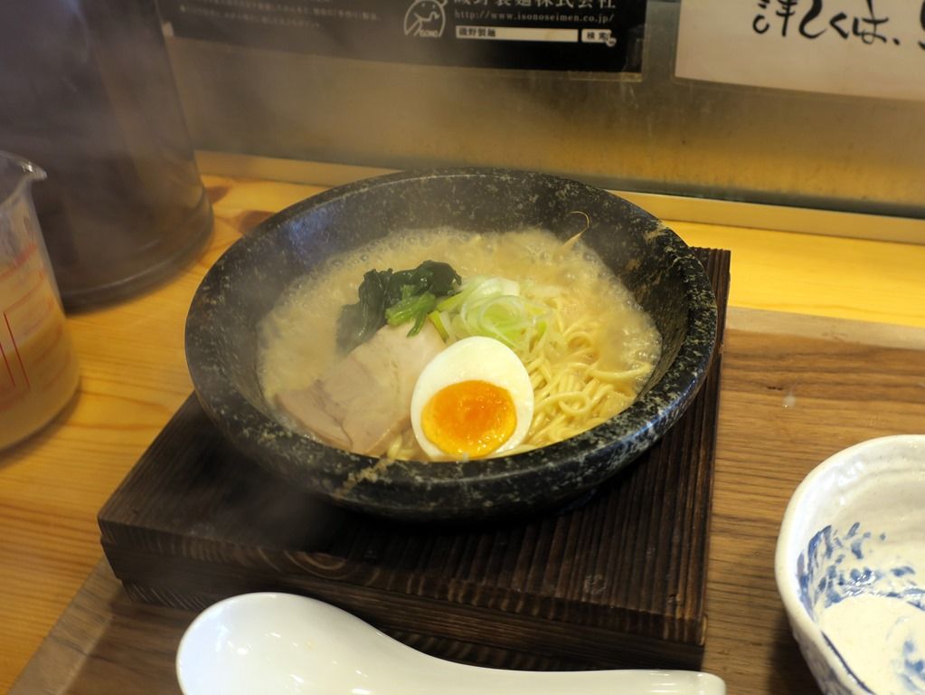 具は、チャーシュー、ほうれん草、味玉半個、きざみねぎ。カウンターが狭くて汁はねが危険なためか、最初に入れるスープが少なくて、そのスープで石鍋の温度を下げて、セルフでスープを後入れさせます。が、そのため、麺が鍋に焦げ付いて、まず麺を剥がす作業からスタート。