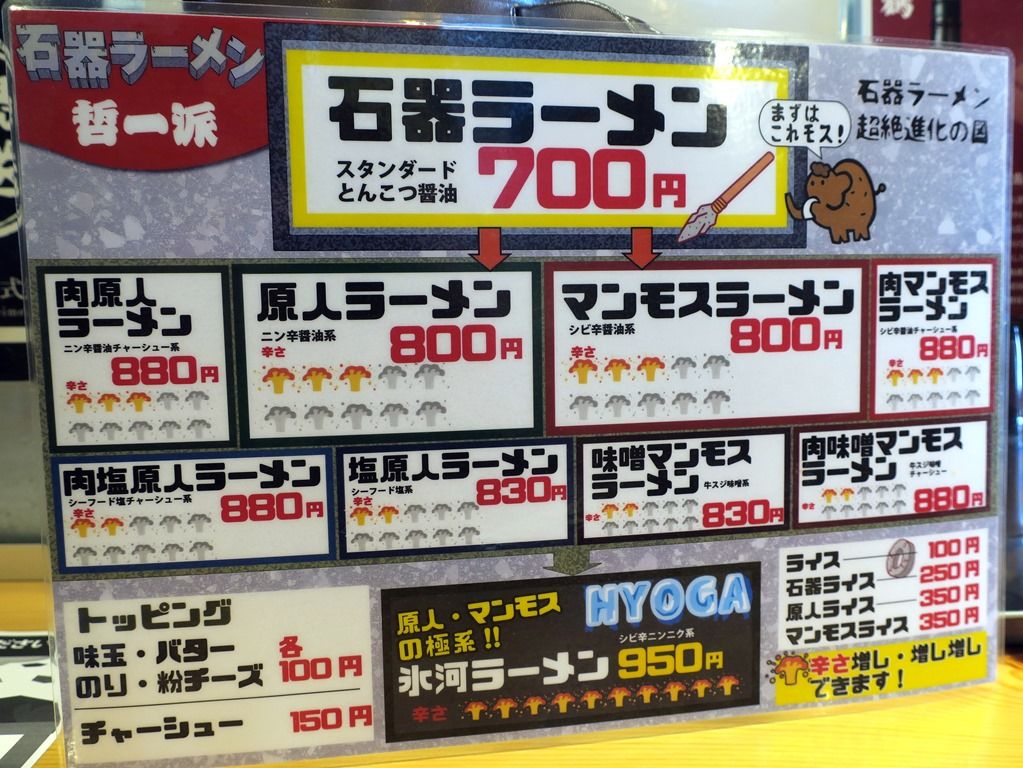 主なメニューは、石器ラーメン(スタンダードとんこつ醤油)700円、原人ラーメン(ニン辛醤油系)800円、マンモスラーメン(シビ辛醤油系)800円、塩原人ラーメン(シーフード塩系)830円、味噌マンモスラーメン(牛スジ味噌系)830円、氷河ラーメン(シビ辛ニンニク系)950円、他。