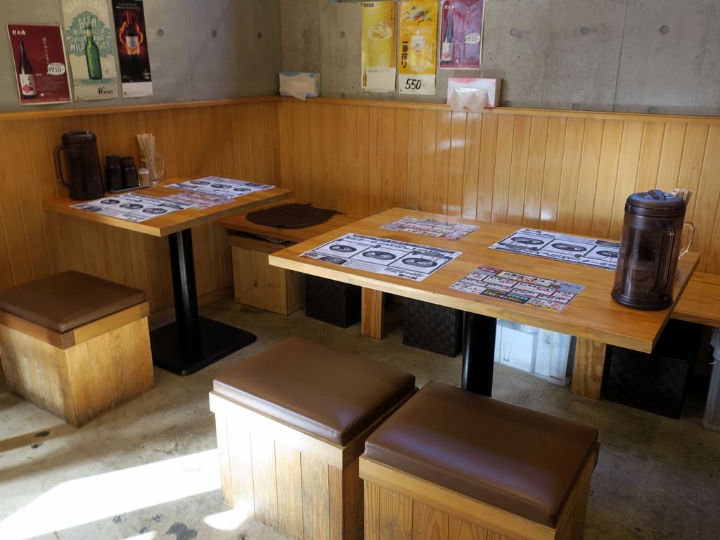 原人ラーメン・マンモスラーメンは辛さ増し・増し増し可能。店内は厨房を囲むL字型カウンター6席(3席・3席)、4人卓x2、2人卓x1。