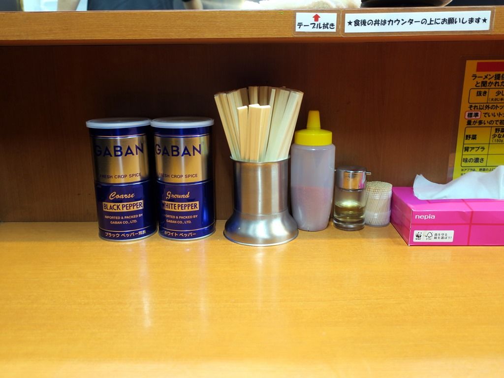店内は、厨房を囲むL字型カウンター12席(6席・6席)。20:50頃到着で先客5、後客6。スタッフは厨房に男性4。BGMは東京FM。箸は割り箸。卓上調味料は、GABANホワイトペッパー・ブラックペッパー、一味唐辛子、酢。