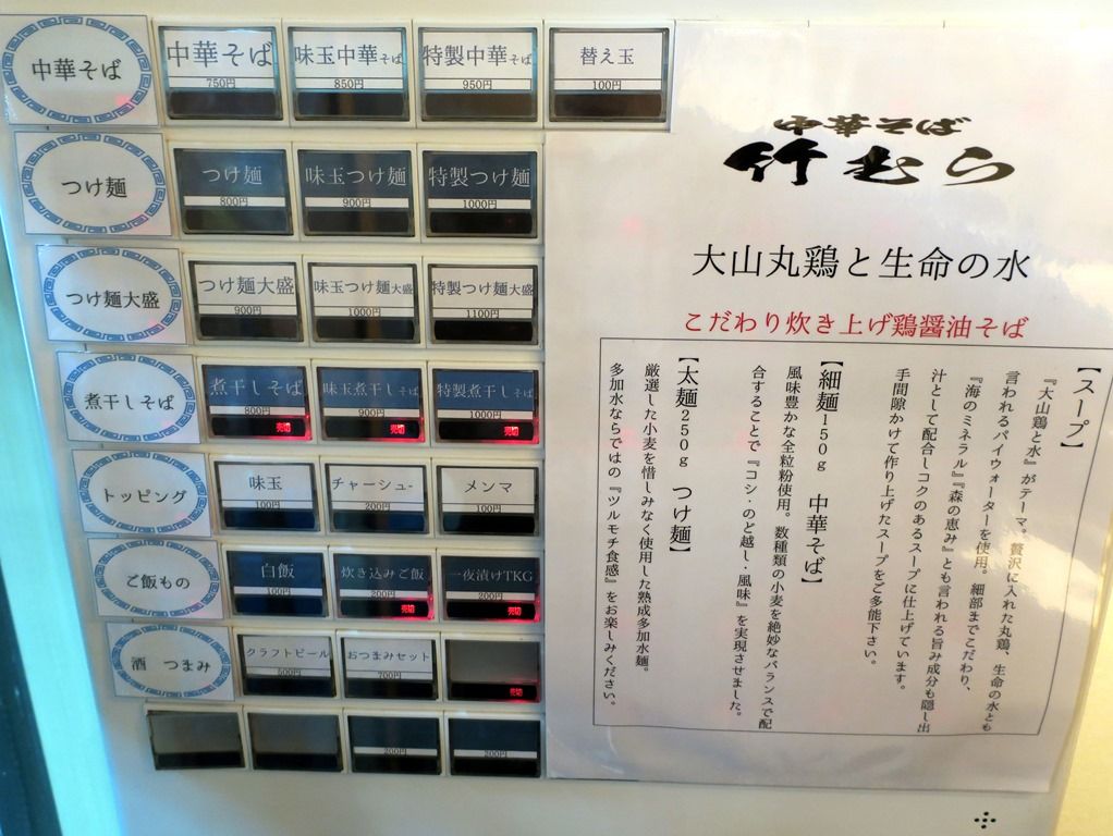 入店すると、まず券売機で食券購入です。主なメニューは、中華そば750円、煮干しそば800円、つけ麺800円、炊き込みご飯200円、一夜漬けTKG200円、他。