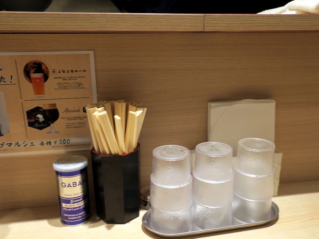 BGMは懐かしのポップス、Eye of the Tigerとか。箸は割り箸。卓上調味料は、GABANブラックペッパー。