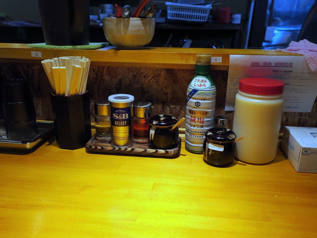 箸は割り箸。卓上調味料は、酢、S&Bブラックペッパー、ラー油、おろしニンニク、キッコーマン減塩しょうゆ、レモンジンジャー。