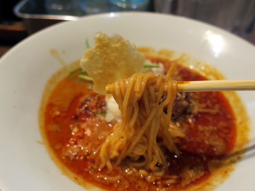 スープはドロっとした芝麻醤とラー油のマグマで、まるで汁多めの汁なし感覚。芝麻醤たっぷりで胡麻の風味とコク演出。さらに、海鮮ラー油と言うカリカリ海老と干し貝柱入りのラー油が、実にいい味出してます。「ばんから」らしくド濃厚な担々麺ですが、濃度だけに留まらない豊かな風味と味わいがあります。思ってたよりずっと美味しい!