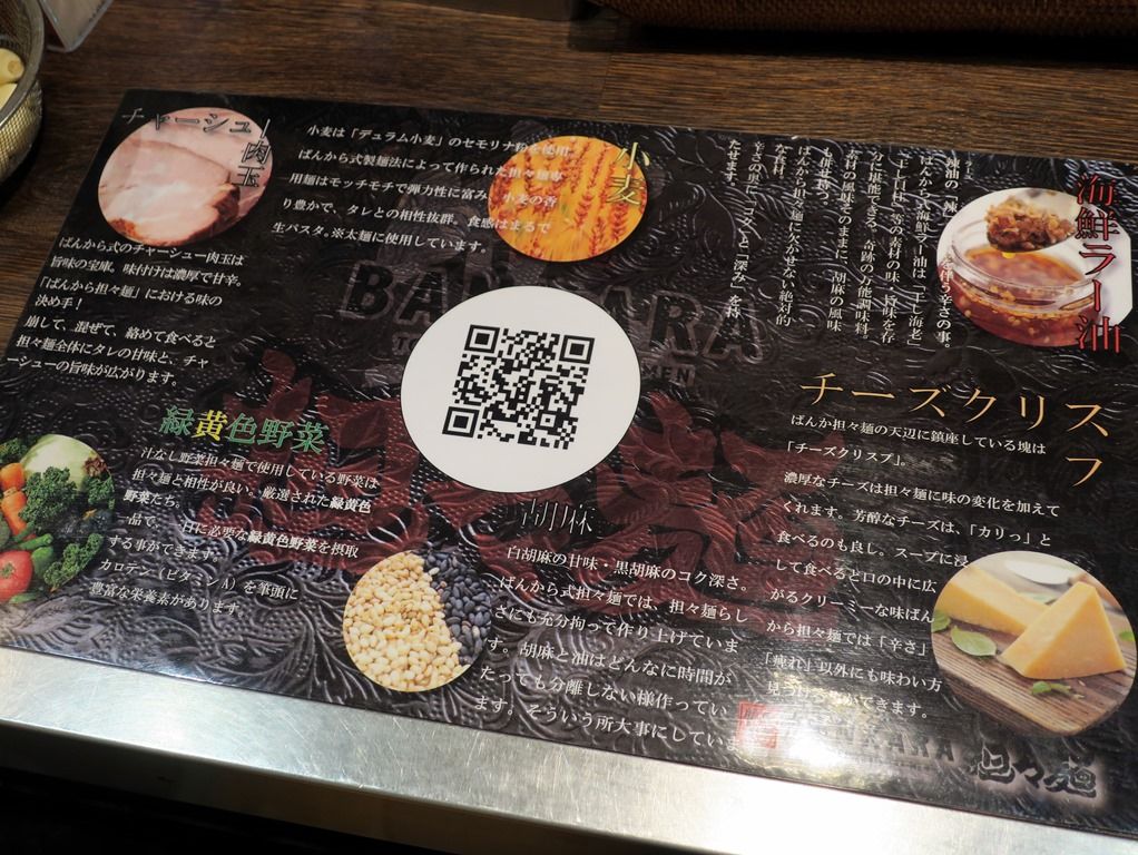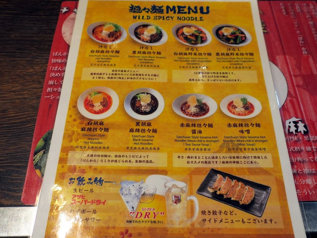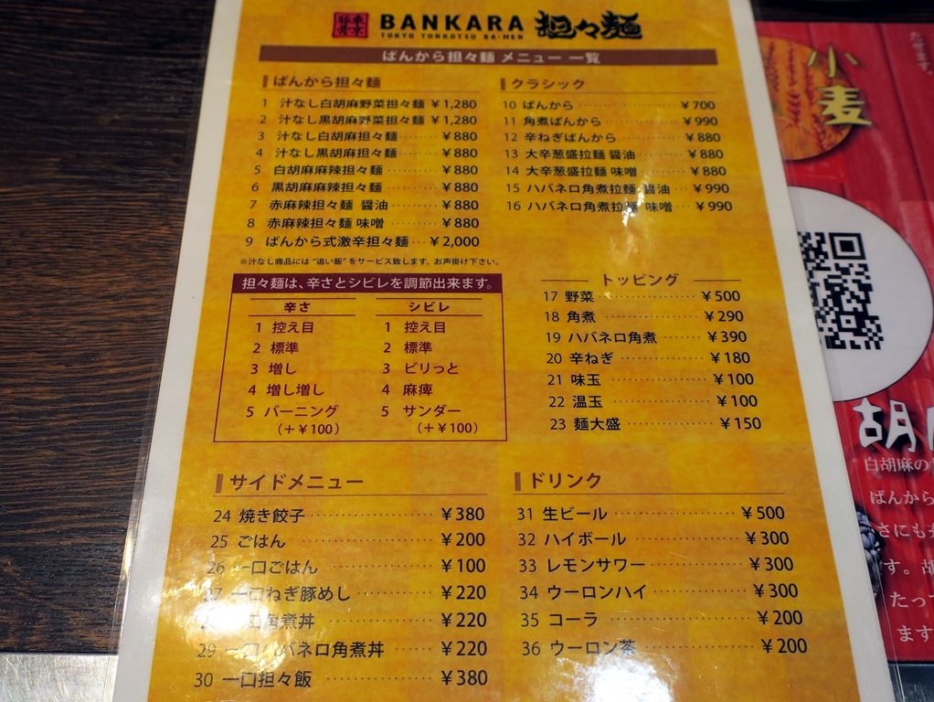 主なメニューは、白胡麻麻辣担々麺880円、黒胡麻麻辣担々麺880円、赤麻辣担々麺醤油880円、赤麻辣担々麺味噌880円、汁なし白ごま麻辣担々麺880円、汁なし黒ごま麻辣担々麺880円、汁なし白ごま野菜担々麺1280円、汁なし黒ごま野菜担々麺1280円、ばんから式激辛担々麺2000円、ばんからラーメン700円、他。