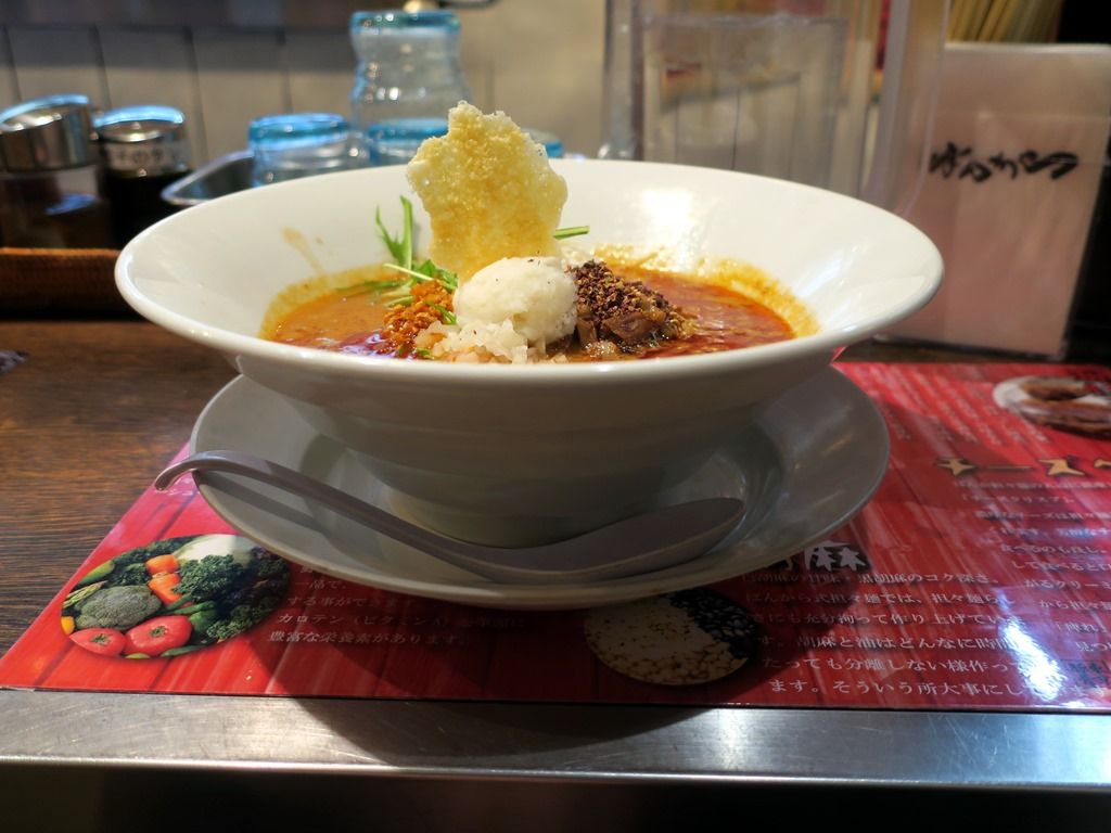 具は、肉玉(肉味噌)、水菜、きざみ白ねぎ、マッシュポテトの台座にチーズクリスプ。肉玉は、ばんからのチャーシューで作ったという旨味たっぷりなもの。