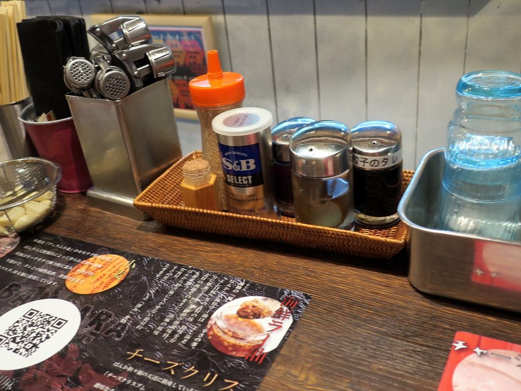 BGMはポップス。箸は割り箸。卓上調味料は、クラッシュ用粒にんにく、切り胡麻、S&Bホワイトペッパー、ラー油、昆布酢、餃子のタレ。