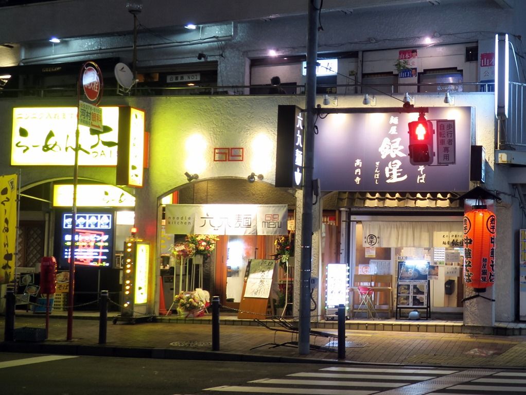 ラーメン大・六九麺・銀星・ビル側面に回って天下一品と、一つのビルに4軒のラーメン店が並んで軒を連ねる高密度ブチ激戦ビル。
