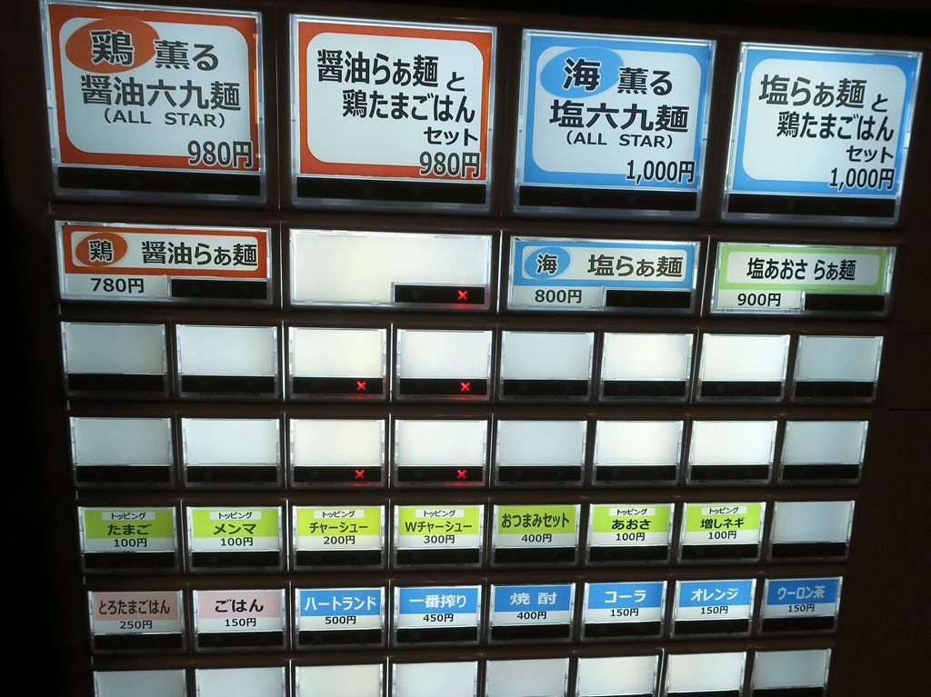 入店すると、まず券売機で食券購入です。主なメニューは、醤油らぁ麺780円、塩らぁ麺800円、鶏薫る醤油六九麺980円、海薫る塩六九麺1000円、鷄たまごはんセット+200円、他。