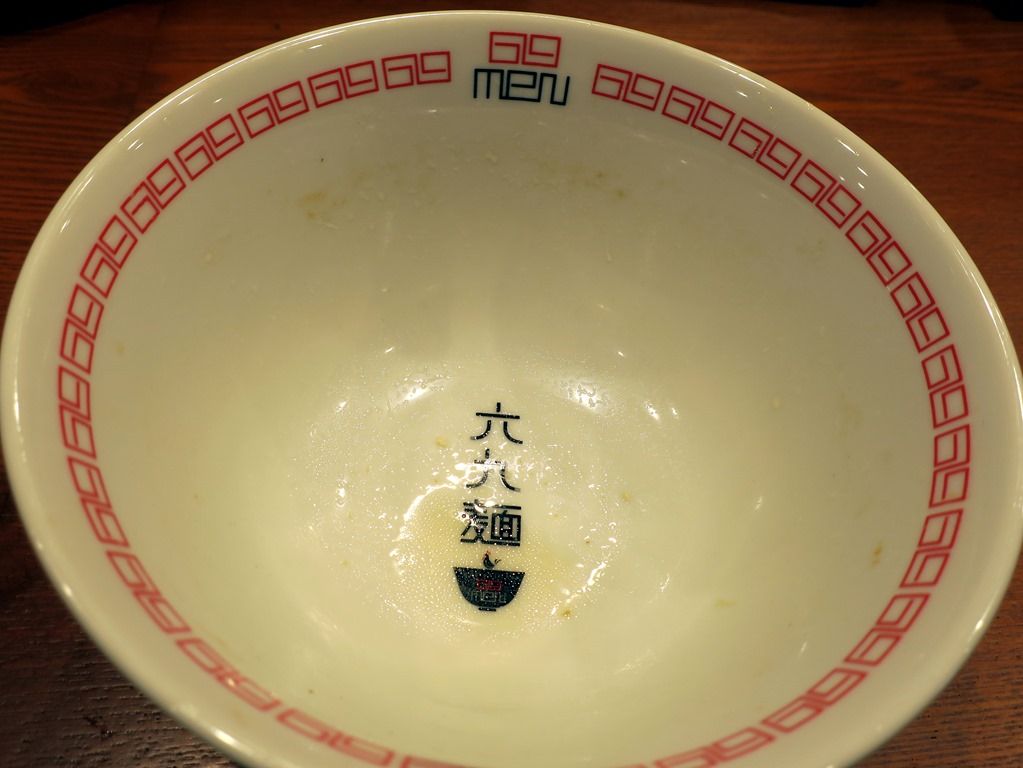 店名ロゴ入りで、縁の模様雷文がよく見ると69のデザインというアートな器で着丼。