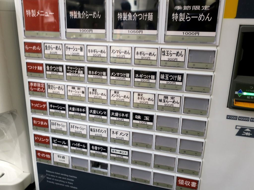 そして、まず券売機で食券購入です。主なメニューは、魚介らーめん800円、魚介つけ麺850円、季節限定ラーメン800円、他。いつもの癖で先頭左端をポチり。食券を渡すと、普通盛・中盛・大盛同料金が告げられます。