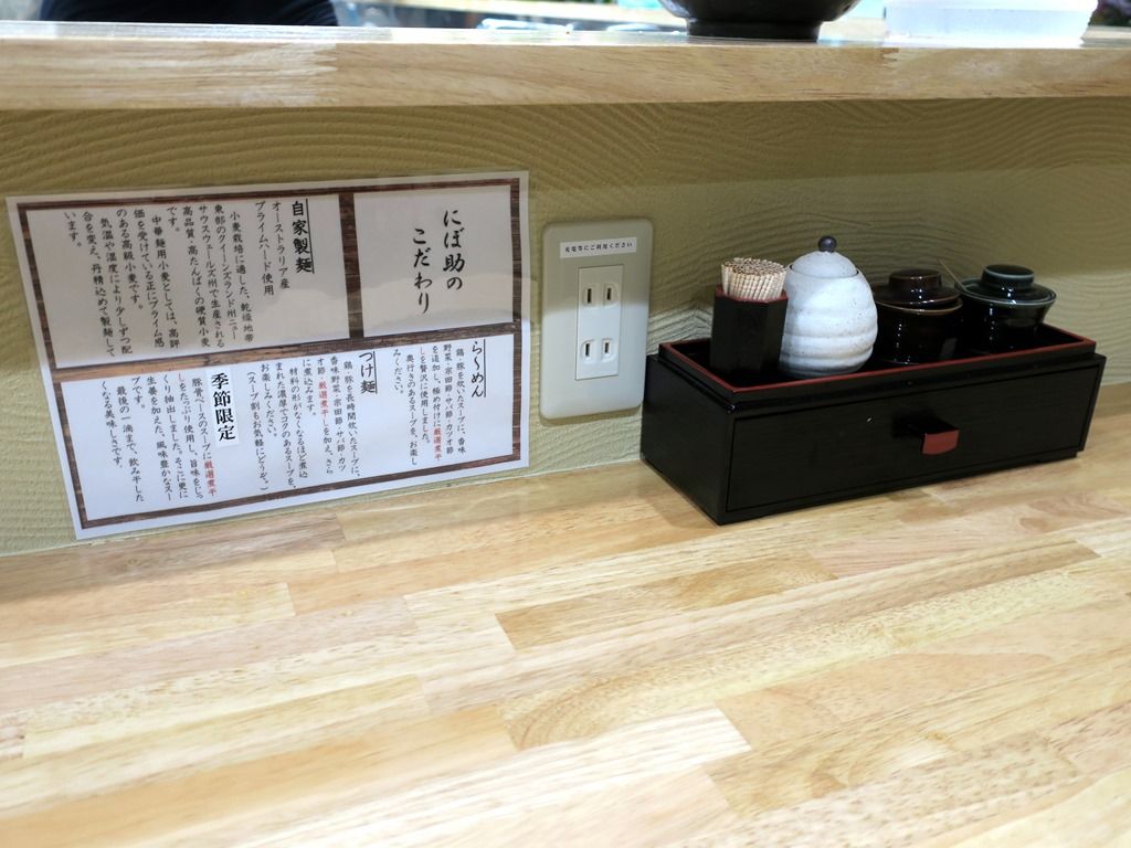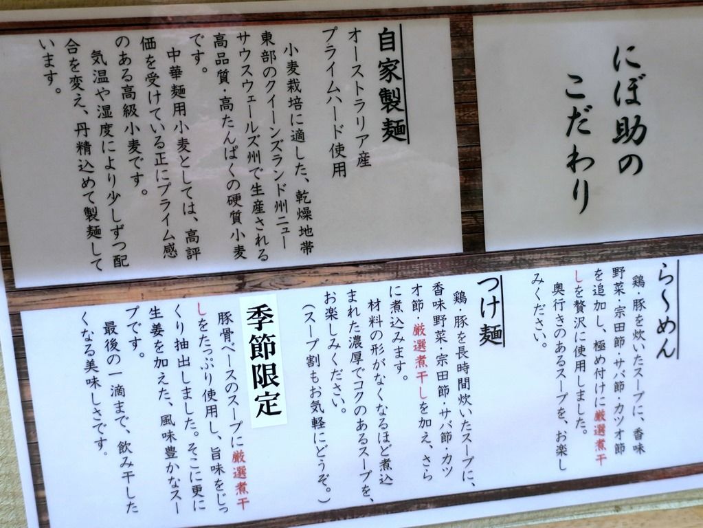 食べてる途中、後のお客さんにメニュー説明していて気づいたのですが、「中華そば」・「つけ麺」は吉岡と基本同じ、「季節限定ラーメン」がこちらオリジナルの新作とか、残念(´・_・`)