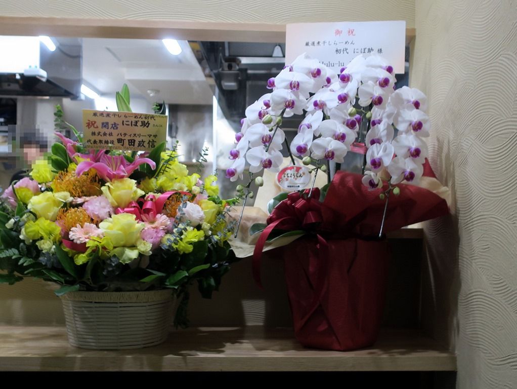 店頭には開店祝花いっぱい。小麦粉卸の千葉製粉グループセンヨー商事からの花が。入店すると、目の前に麺屋hulu-luからの花。