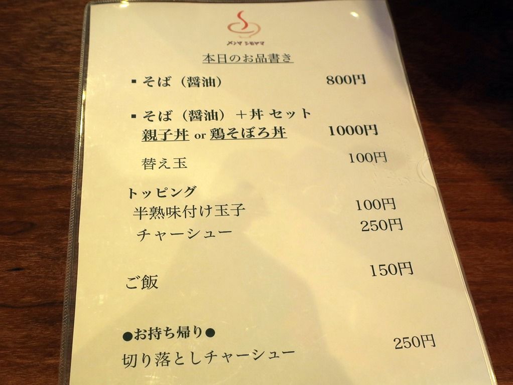 券売機は無く後会計制。主なメニューは、そば(醤油)800円、そば(醤油)+丼セット(親子丼 or 鶏そぼろ丼)1000円、替え玉100円、味玉100円、他。訪問時ご飯と味玉が売り切れで謝ることしきり。