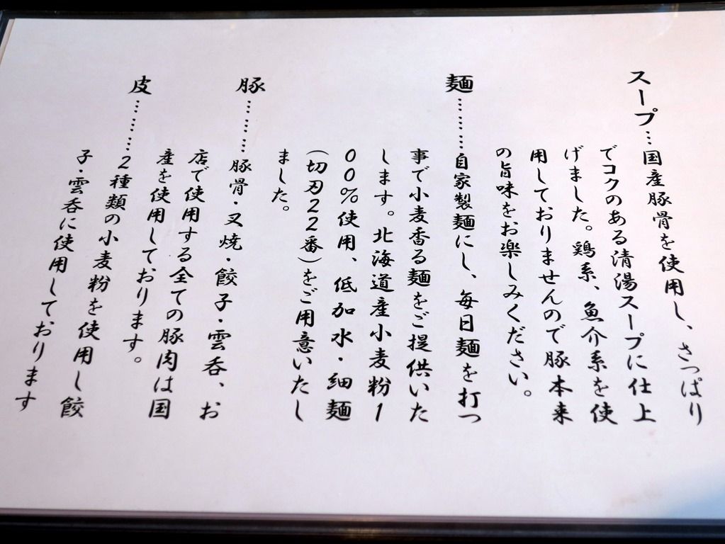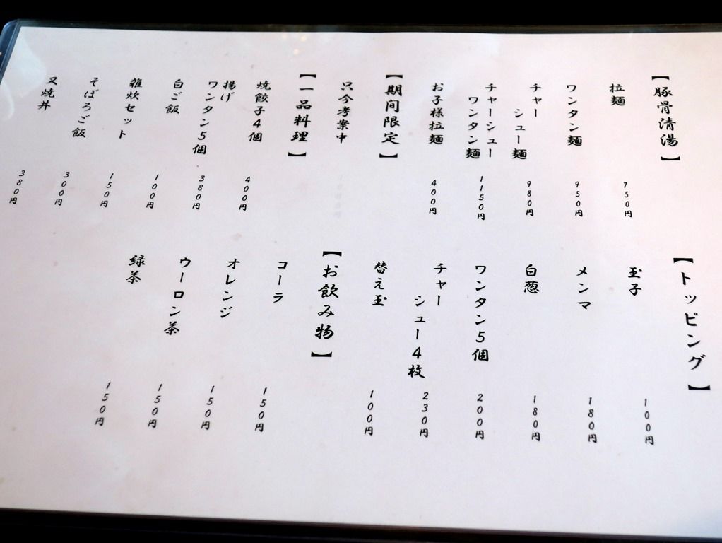 券売機は無く後会計制。主なメニューは、拉麵750円、雲呑麺950円、他。