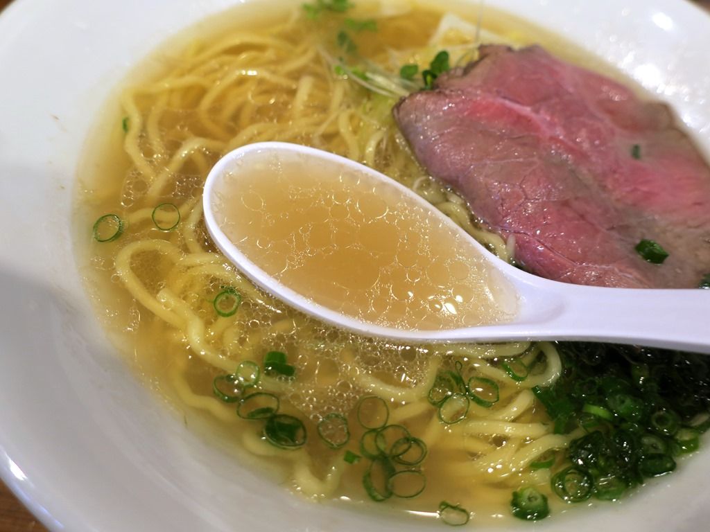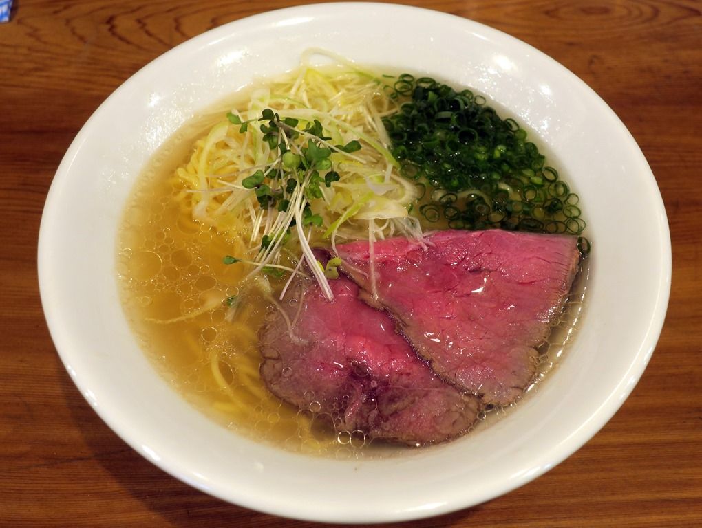 具はビーフチャーシュー、スプラウト、小口切りねぎ、きざみ青ねぎ。スープはさらさらの清湯塩味。牛出汁特有の旨味と風味、牛脂のコクと甘みがはっきりと出ていて、メリハリのある分かりやすい味わい。これぞ牛スープの白眉と言いたくなる徹頭徹尾牛全開のフレーバー&テイストで凄く美味しい!